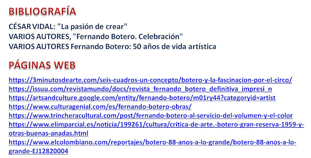 "Los toros hacen la vida fácil al pintor porque es una actividad que ya de por sí tiene mucho color. El traje de luces del matador, la arena, la barrera, el público... Es un tema maravilloso, le da poesía a la pintura“ BOTERO "La muerte de Luís Chalet", 1984 Botero explora las formas, los colores, el vestuario y el mundo plástico y poético del clero satirizándolo con humor no exento de una cierta crítica. "Monja comiendo una manzana", 1981 "Botero ha llenado sus cuadros de clérigos más por motivos visuales que espirituales, y así vinculó su obra a esos mentores y expresó un mundo en el que, en efecto, como en la Italia de las ciudades-estado, la Iglesia era omnipresente ". VARGAS LLOSA "El Nuncio", 2004